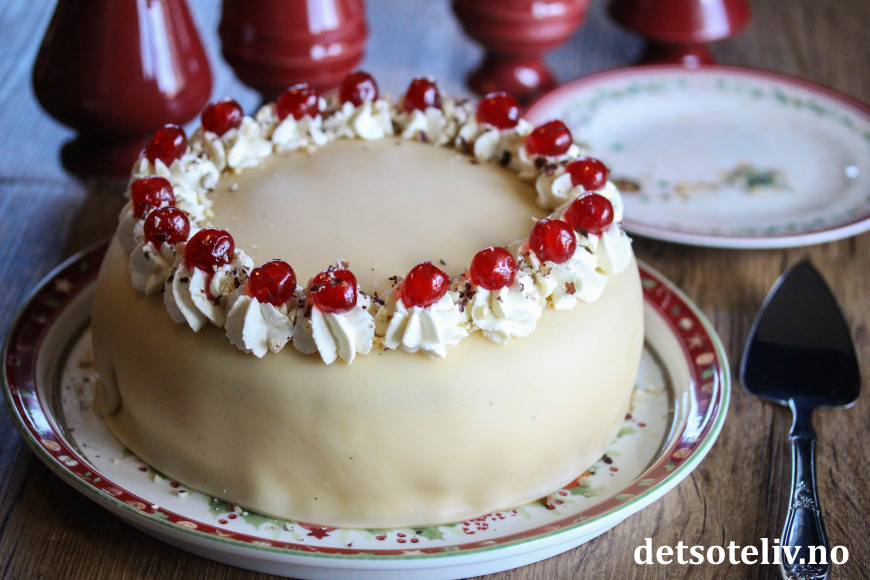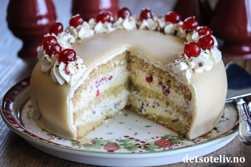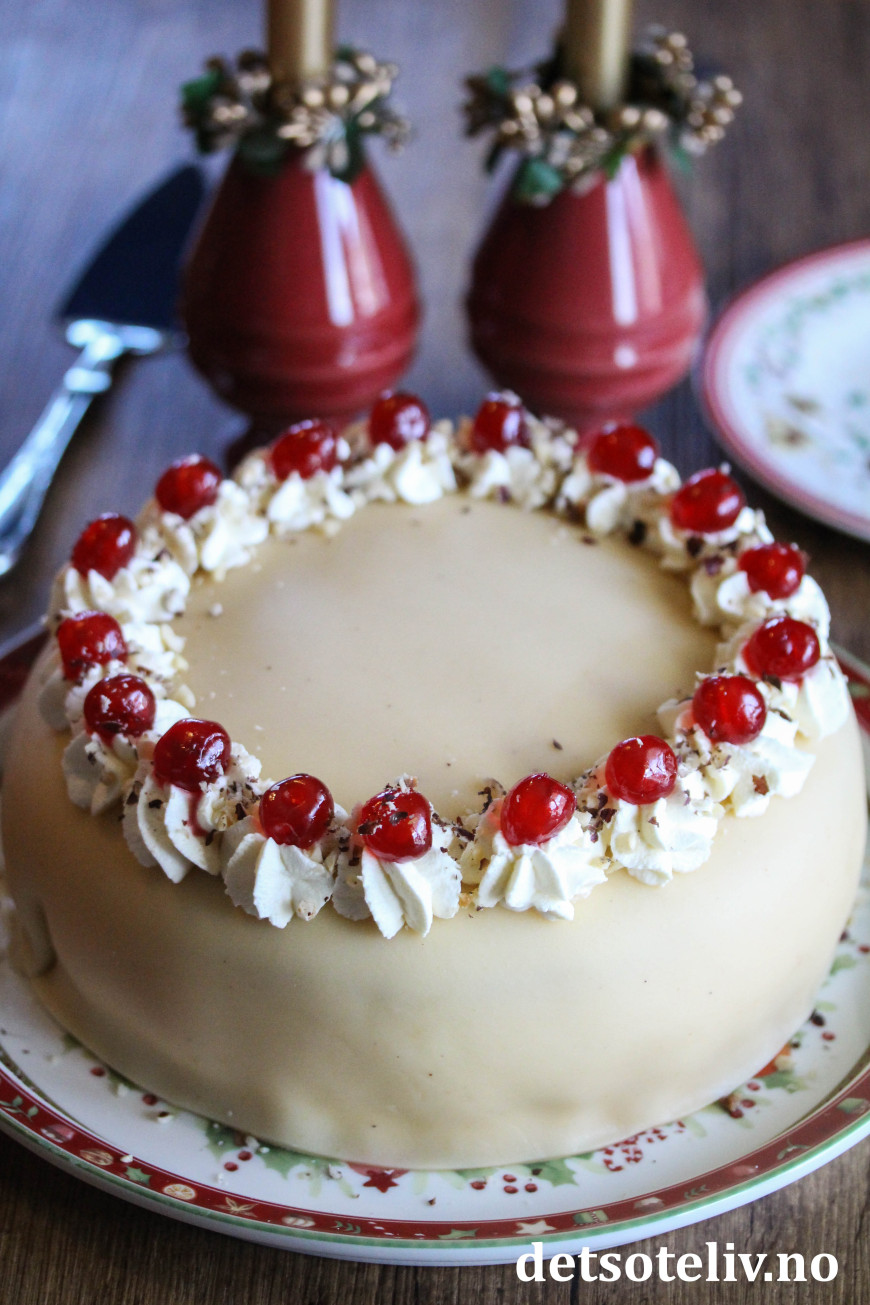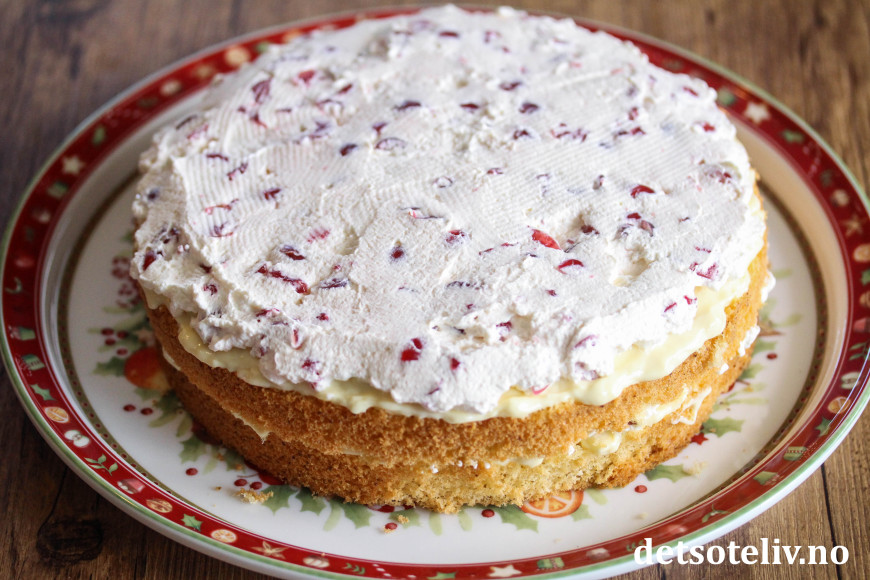 Kaken er fylt med vaniljekrem, hasselnøttkrem og krem med hakkede røde cocktailbær, og passer fantastisk bra til julehøytiden!