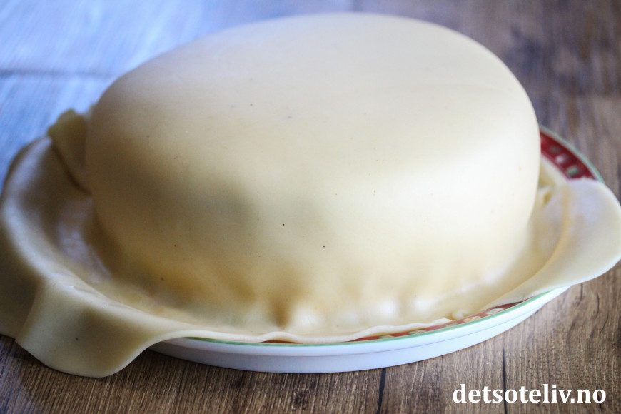 Ha deigen i en rund kakeform (24 cm i diameter) med bakepapir i bunnen.