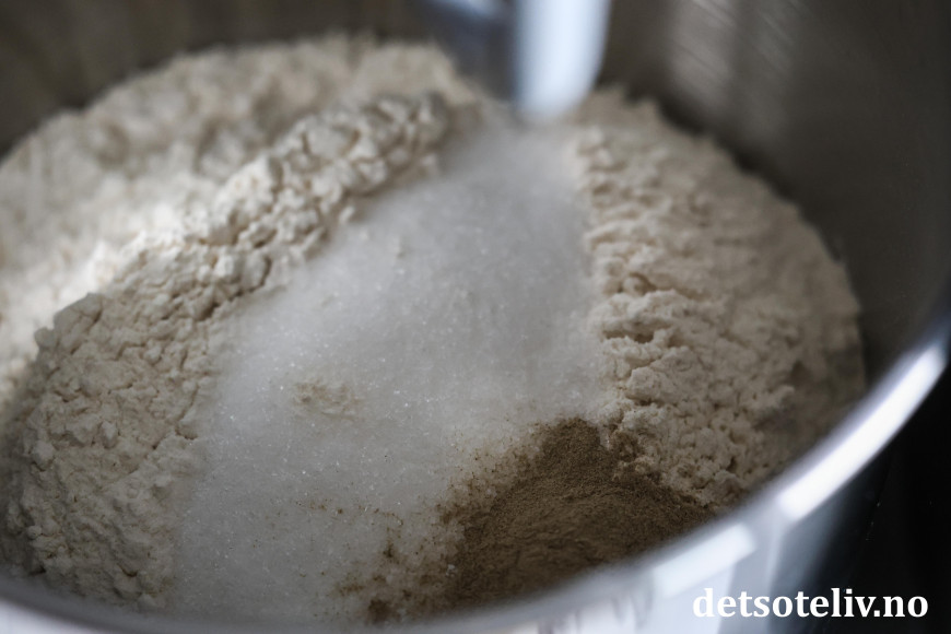 Ha mel, sukker og krydder i bakebollen. Bruk romtemperert melk (se tips) og løs opp gjæren i melken. Tilsett sammenvispet egg. Ha dette i bakebollen. Elt deigen rolig i ca. 5 minutter.