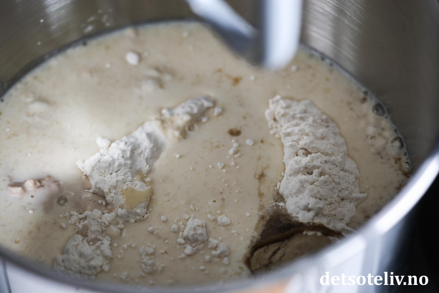 ♥ Vær nøye på at melken ikke er for varm, særlig hvis du bruker en kraftig kjøkkenmaskin som Wilfa Probaker. Når smøret skal knas inn i deigen til slutt, kreves det noe lengre eltetid, og da vil deigen bli varmet opp av selve eltingen.