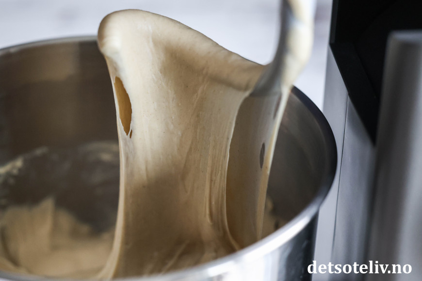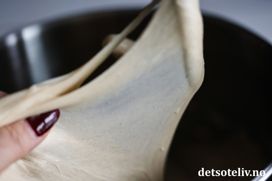 Sjekk at deigen har blitt elastisk og kan dras i uten å sprekke opp (sjekk av glutennettverket i deigen), men vær også nøye på å ikke elte deigen for lenge (se tips).