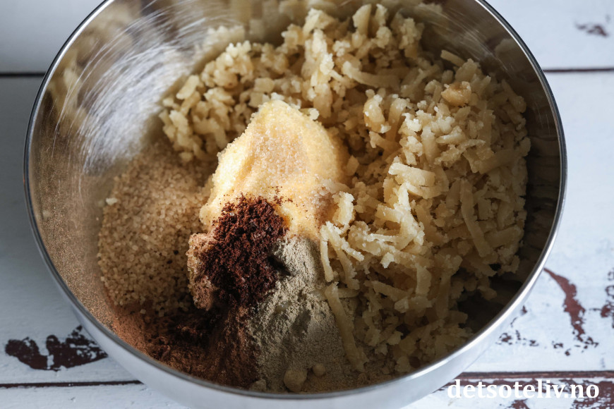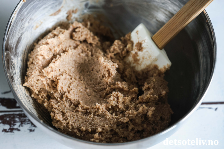 Ha mykt smør i en bolle sammen med brunt sukker, pepperkakekrydder og revet marsipan.