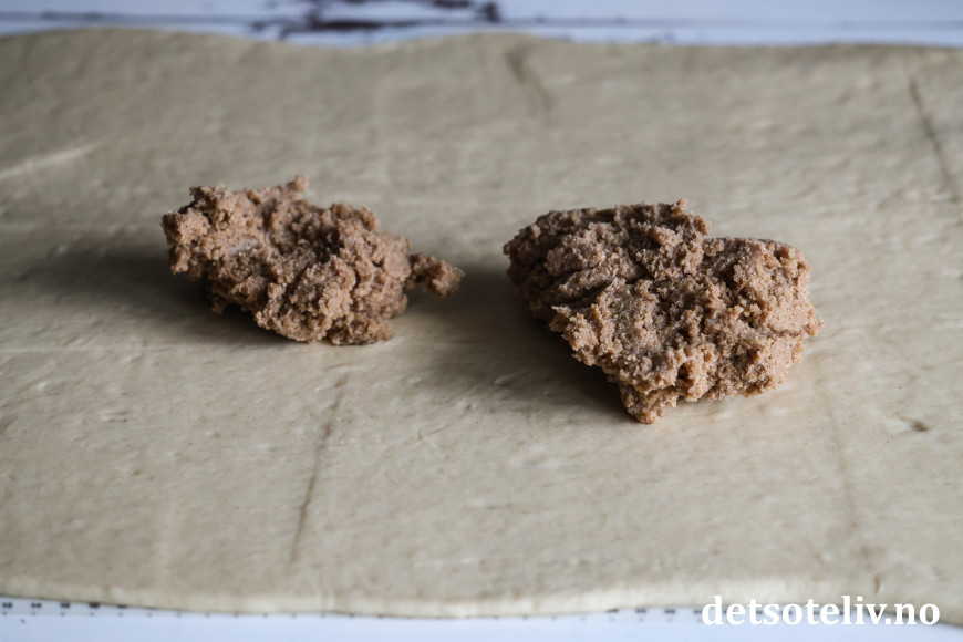 ♥ I stedet for å forme bollene som beskrevet, kan du lage klassiske snurrer ved å kjevle ut deigen, ha over fyllet og så rulle sammen leiven til en rull, for så å skjære rullen i skiver.