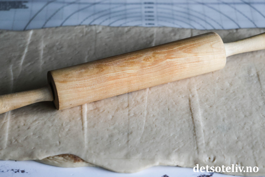 Brett deigen over på midten slik at leiven blir dobbel. Kjevle over forsiktig for å jevne ut den doble leiven.