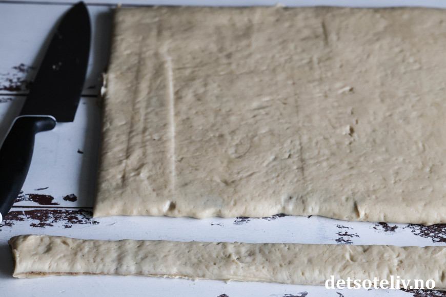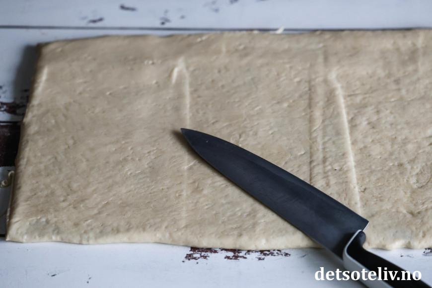 Brett deigen over på midten slik at leiven blir dobbel. Kjevle over forsiktig for å jevne ut den doble leiven. Renskjær kantene. Skjær deigen i remser (ca. 3 cm brede), tvinn dem og rull sammen til snurrer.