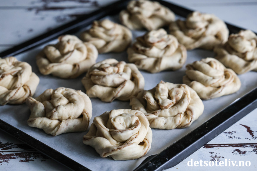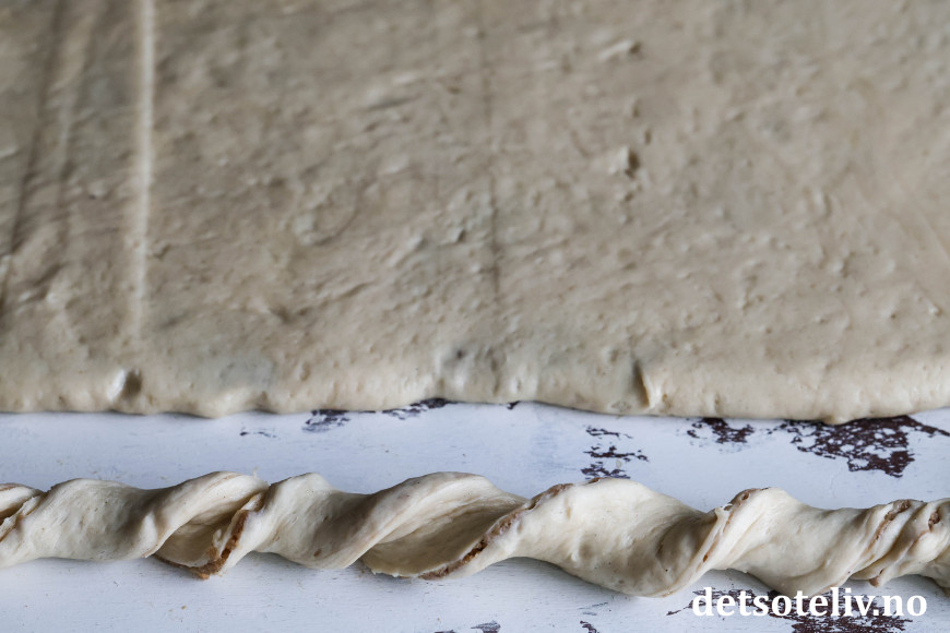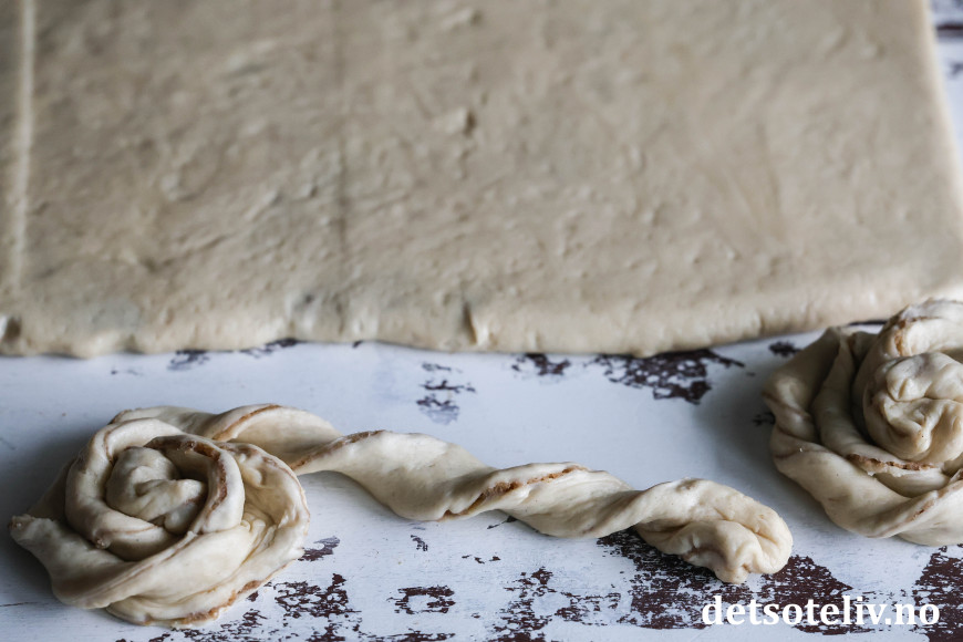 Skjær deigen i remser (ca. 3 cm brede), tvinn dem og rull sammen til snurrer.