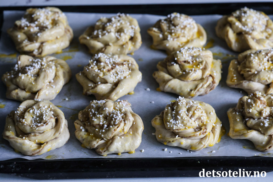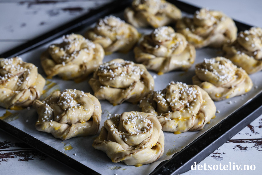 Legg snurrene på bakepapirdekket stekeplate. Etterhev snurrene i 20 minutter. Pensle over med sammenvispet egg og dryss på perlesukker.