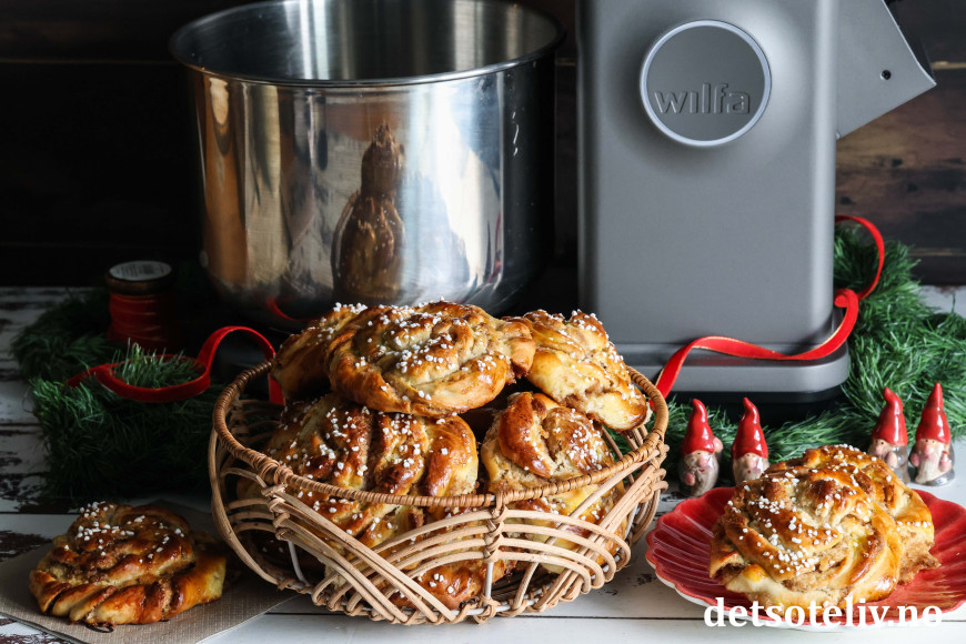 Jeg har her brukt min oppskrift på såkalt fransk gjærdeig, der smøret knas inn i deigen helt til slutt (se blant annet Franske kanelboller og Franske vaniljeboller). Til en slik type gjærdeig er det ekstra kjekt med en kjøkkenmaskin som har så gode elteegenskaper som Wilfa Probaker! De ferdigstekte snurrene blir usedvanlig myke og gode! 😋