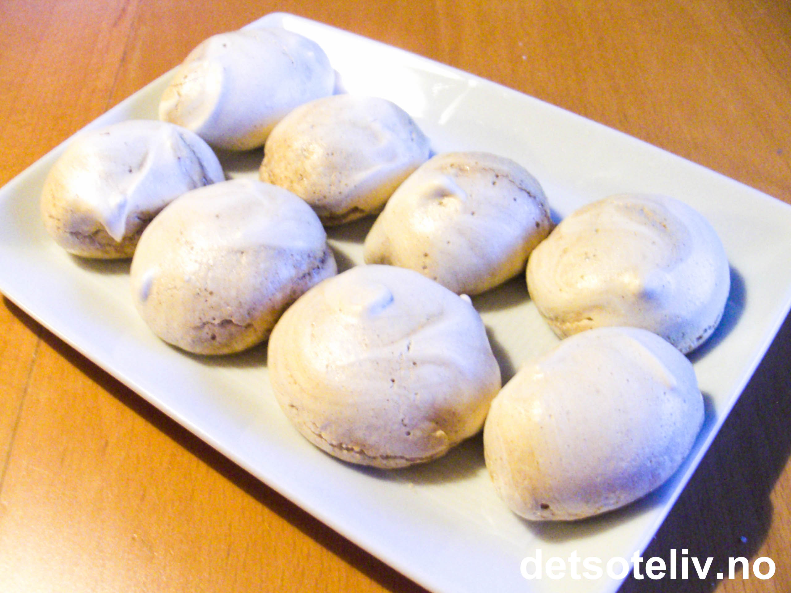 Sett små marengstopper ved hjelp av to teskjeer på bakepapirdekkede stekeplater. Stek marengsen midt i ovnen ved 125°C i ca 1 time, til marengsene kjennes tørre og lette. (Har du varmluftsovn, kan du steke to plater samtidig.)