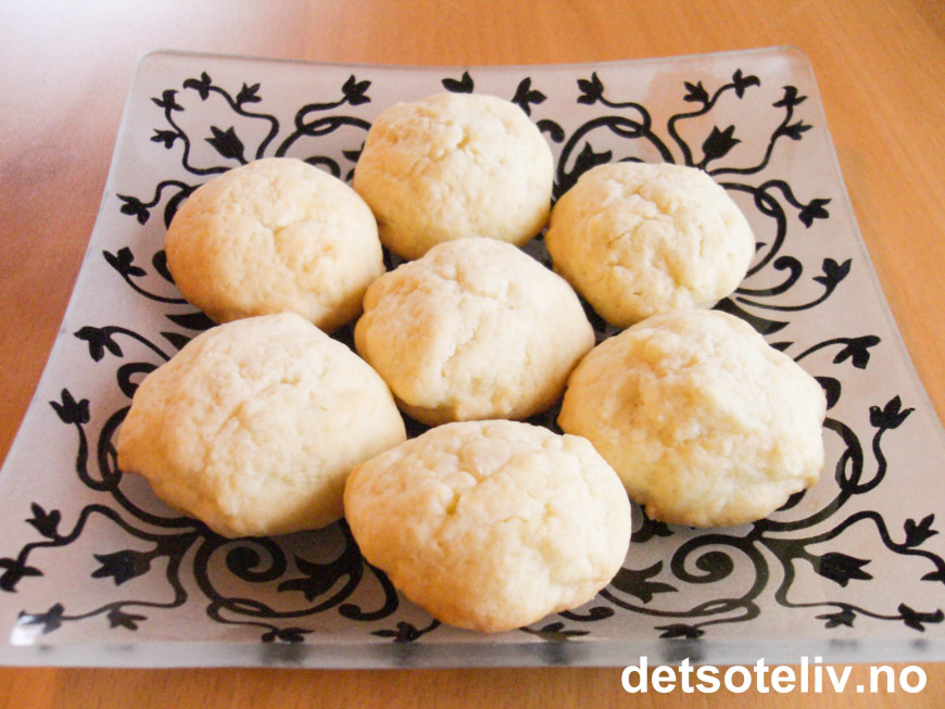 Sett deigen i små topper med to teskjeer på bakepapirdekkede stekeplater. Stek kakene midt i ovnen ved 175°C i 12-15 min. Avkjøles på rist.