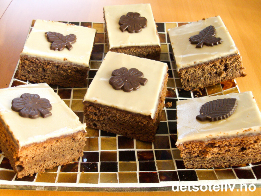 Ta kaken ut av formen og fjern bakepapiret. Rør sammen melis og Kahlua til glasuren (tilpass mengden melis til du får en glasur med passe smørekonsistens). Smør glasuren over kaken. Del den deretter opp i firkanter. Pynt hvert kakestykke med sjokoladeblader, mokkabønner eller annen form for sjokoladedekor.
