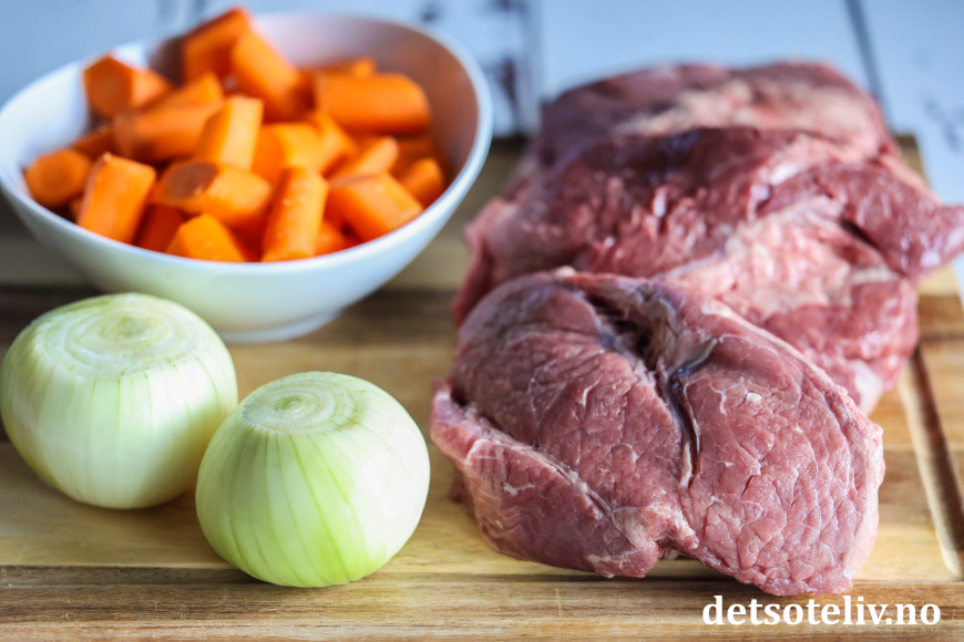 Start med å finne frem kjøtt, løk og gulrøtter.