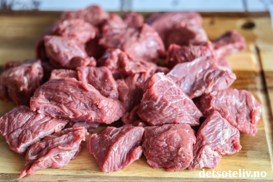 Skjær kjøttet i store terninger (ca. 4 x 4 cm).