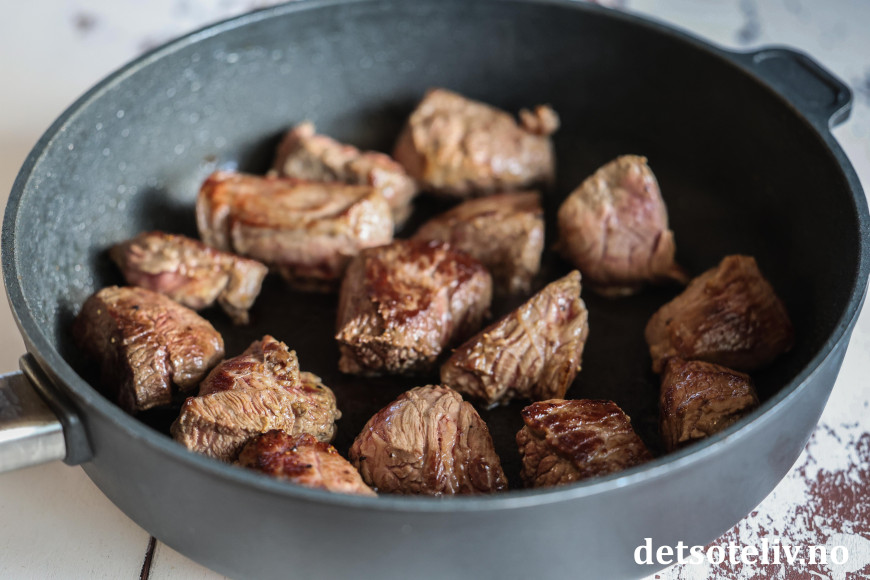 Ha olje i en stekepanne og stek kjøttbitene på høy varme slik at de får en fin stekeskorpe. Ikke ha for mange kjøttbiter i pannen om gangen, slik at alle kjøttbitene har god nok plass i pannen til å bli brunet skikkelig.