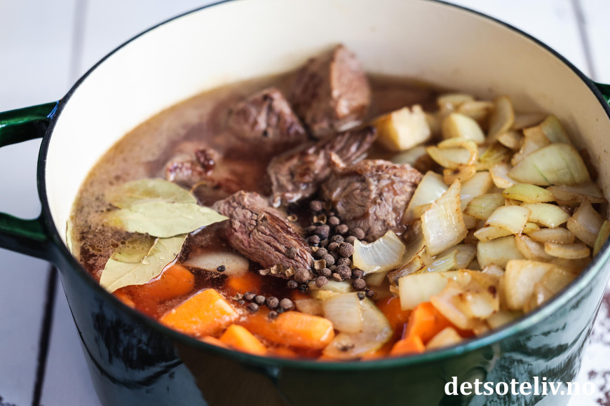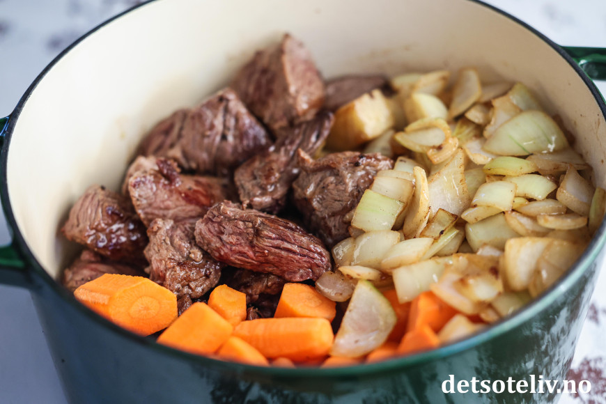 Ha de brunede kjøttbitene i en gryte. Kok ut stekepannen med litt vann og ha stekesjyen over i gryten.