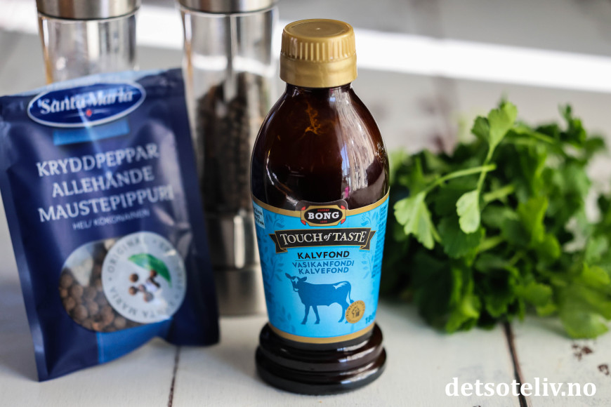 ♥ Jeg brukte her konsentrert kalvefond, som fås kjøpt i velassorterte matbutikker. Du kan alternativt bruke oksefond eller et par terninger kjøttbuljong.