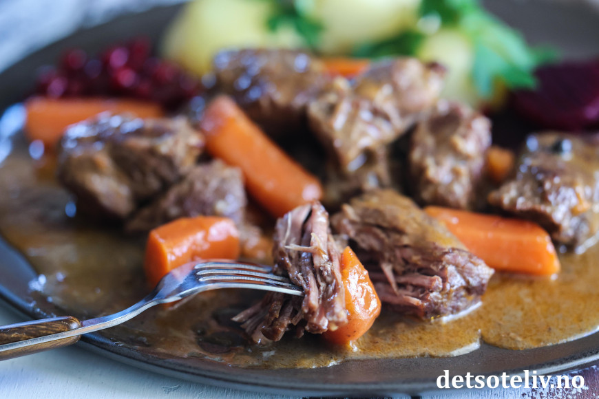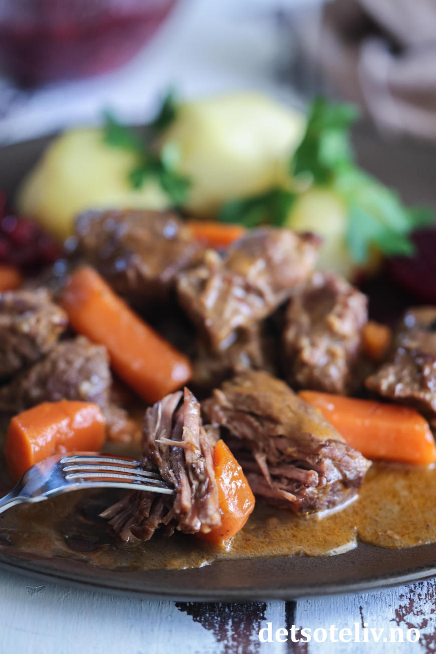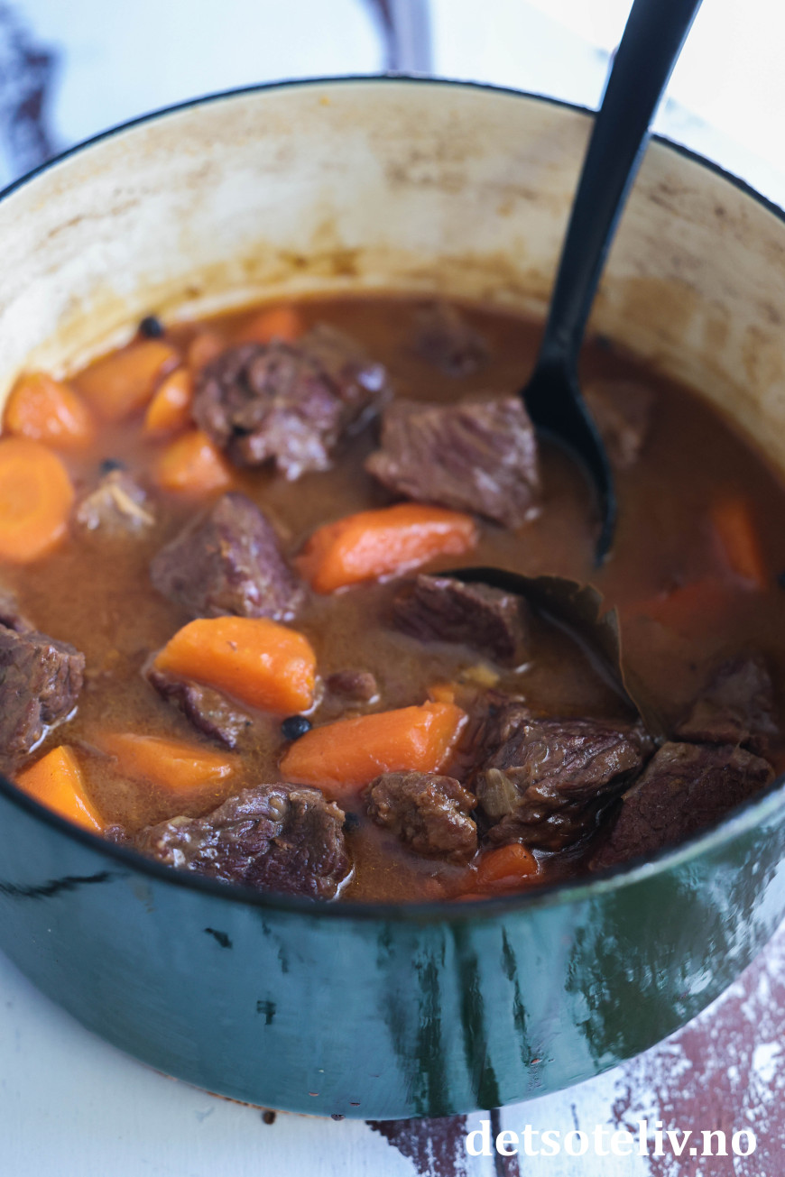 ♥ Det er viktig at du ikke koker gryten for hardt, for det vil bare gjøre at kjøttet avgir væske og blir tørt. Gryten skal småputre (slik at det bare kommer noen små bobler innimellom) over lang tid slik at kjøttet gradvis mørner, men samtidig beholder saftigheten.