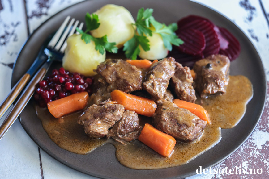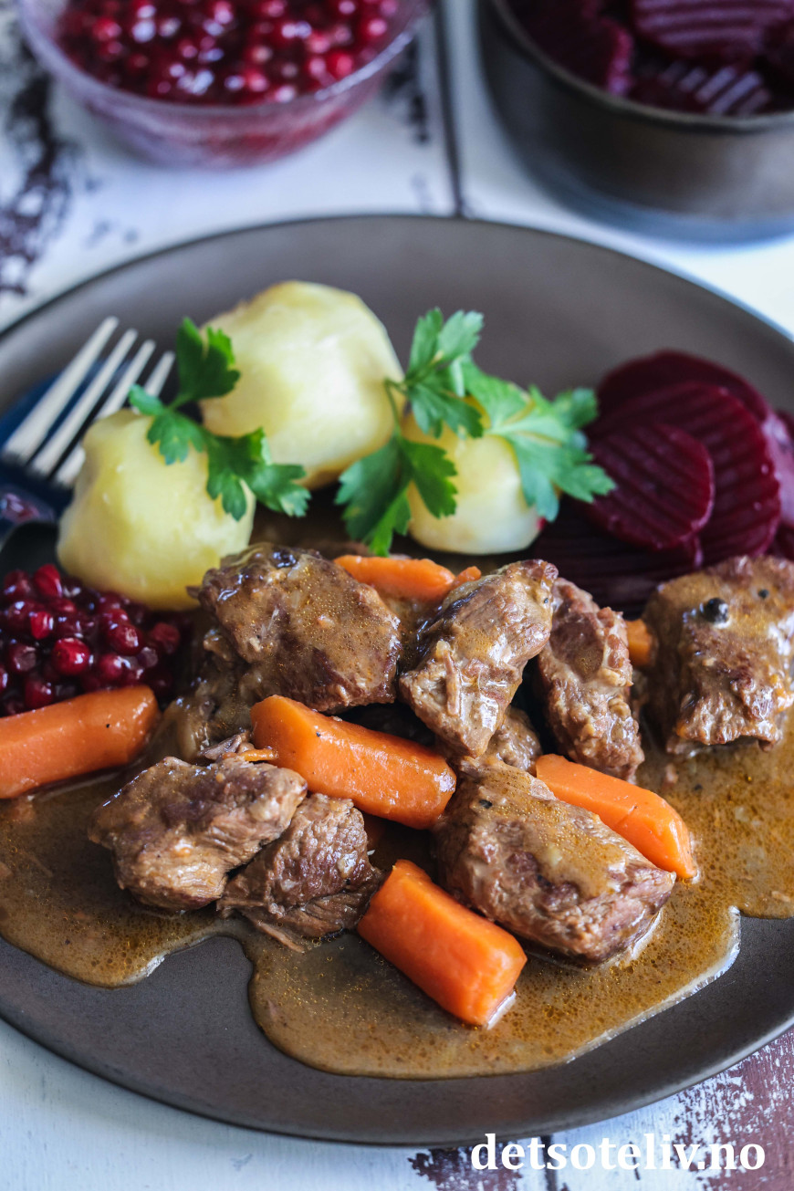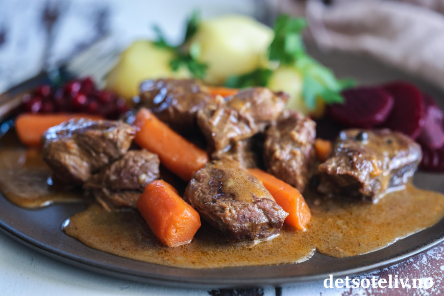 ♥ Hel allehånde (kryddpepparkorn) er korn som ser ut som store pepperkorn. De setter en særegen smak på denne kjøttgryten. Fås kjøpt i velassorterte matbutikker. Ikke overdriv mengden, for disse kornene setter en nokså markant smak på gryten.