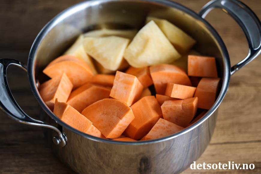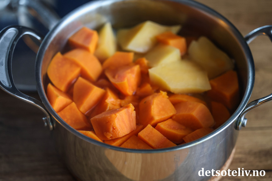 Rens kålrot og søtpotet og del i mindre biter. Ha bitene i en kjele med lett saltet vann og kok dem helt møre.