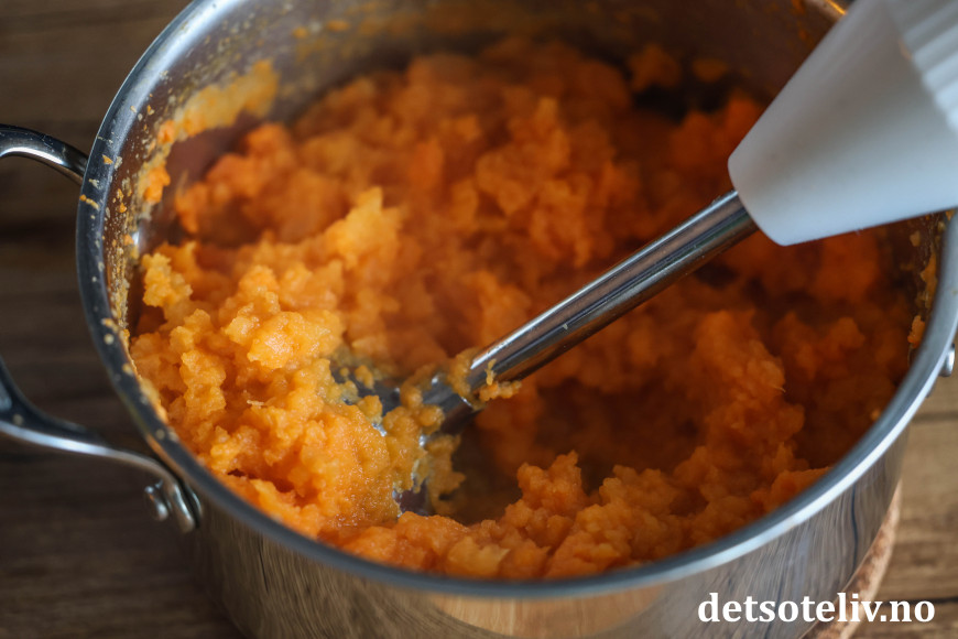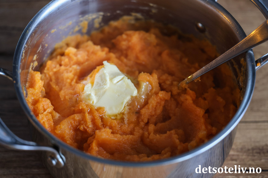 Hell av vannet og mos kålrot- og søtpotetbitene til en stappe (bruk gjerne en stavmikser til dette).