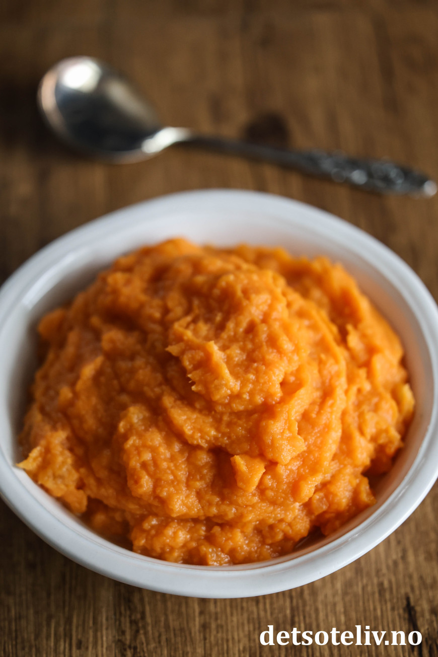 Mos kålrot- og søtpotetbitene til en stappe (bruk gjerne en stavmikser til dette).