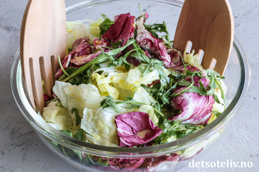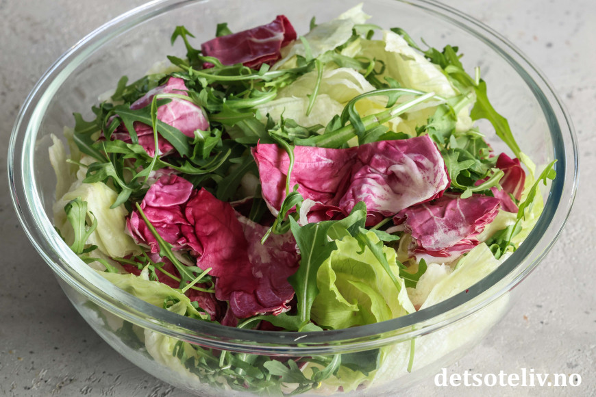 Bryt opp isbergsalat og radicchio i store biter. Bland med ruccola.