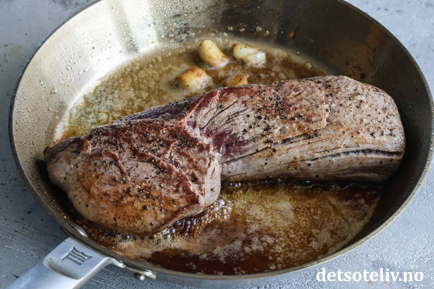 Stek kjøttet raskt på nokså høy varme slik at det blir godt brunet på alle sider. Tilsett smør og øs det smeltede smøret over kjøttet noen ganger.