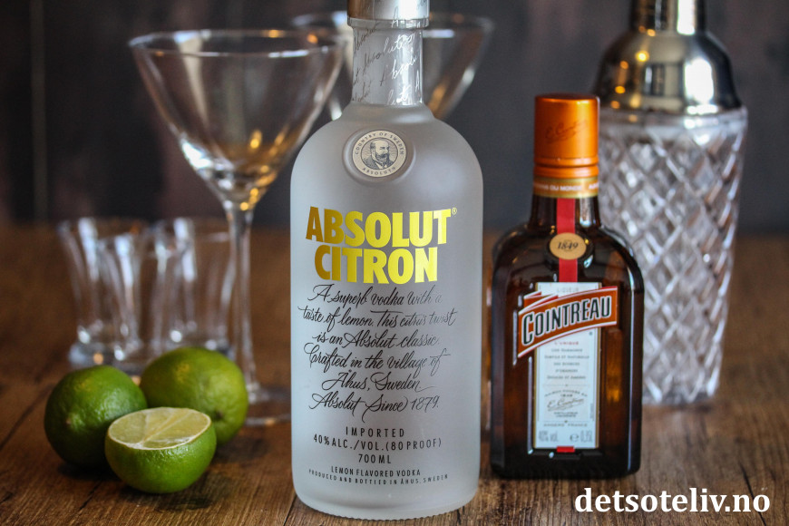Ha like deler vodka, cointreau og limesaft i en shaker som er fylt med isbiter.