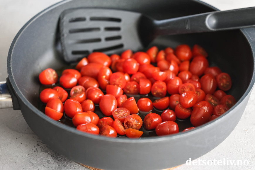 Start med å skjære tomatene over på midten. Ha dem i en panne sammen med olivenoljen.