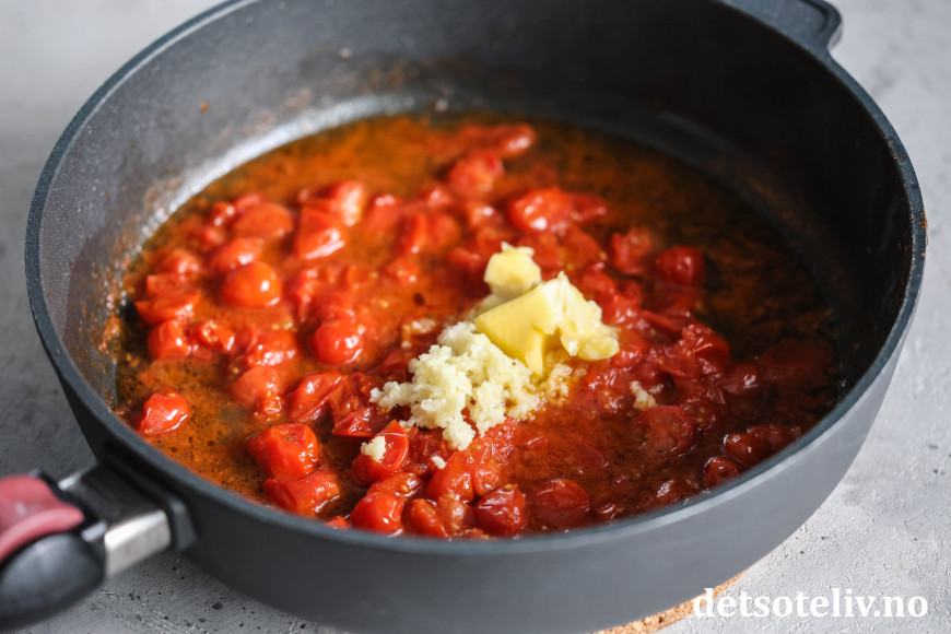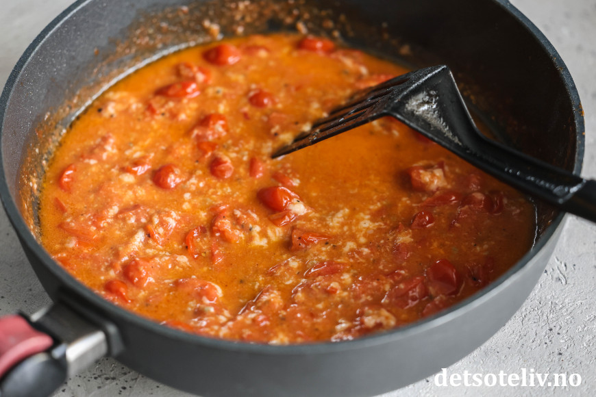 La dette surre på middels varme i 8 - 10 minutter. Ettersom tomatene blir myke, kan du knuse dem lett med en stekespade slik at tomatsaften blander seg med oljen.