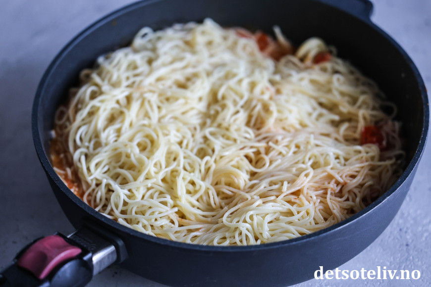 ♥ Capellini fås kjøpt i velassorterte matbutikker. Dette er som sagt veldig tynne spagetti, som trenger kort koketid (ca. 3 minutter). Begynn derfor ikke på kokingen av pastaen for tidlig. Det er viktig at pastaen ikke blir overkokt. Løft pastaen ut av pastavannet og over i pastasausen rett før pastaen er al dente, og la pastaen koke helt ferdig sammen med pastasausen.