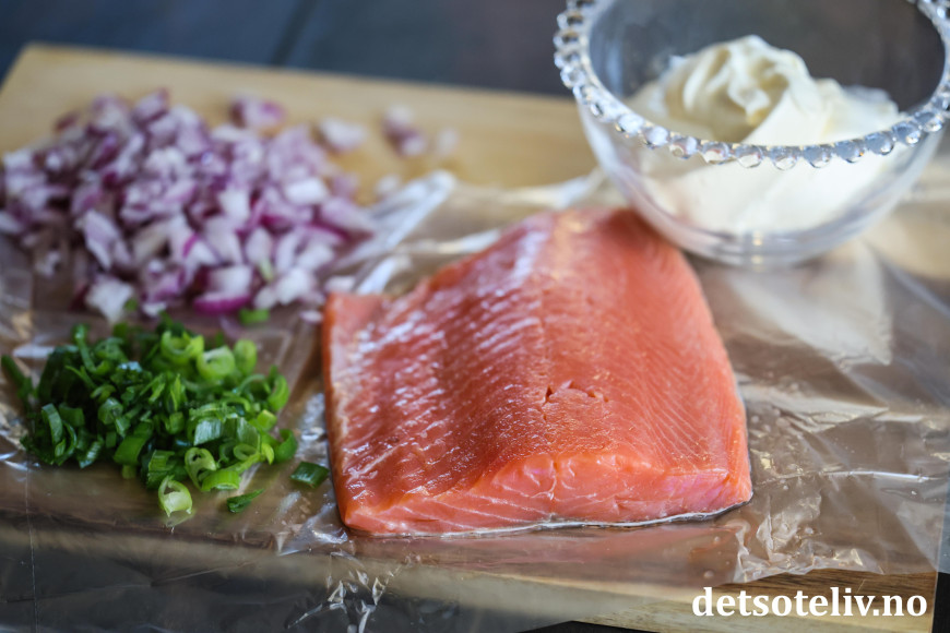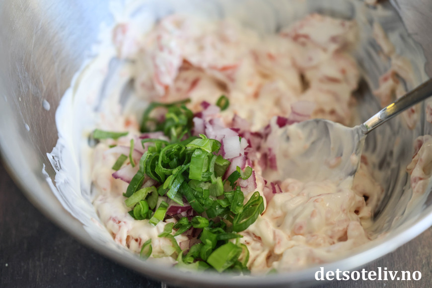 Bland fisken med seterrømme og fint hakket rødløk og vårløk (spar litt hakket løk til pynt).