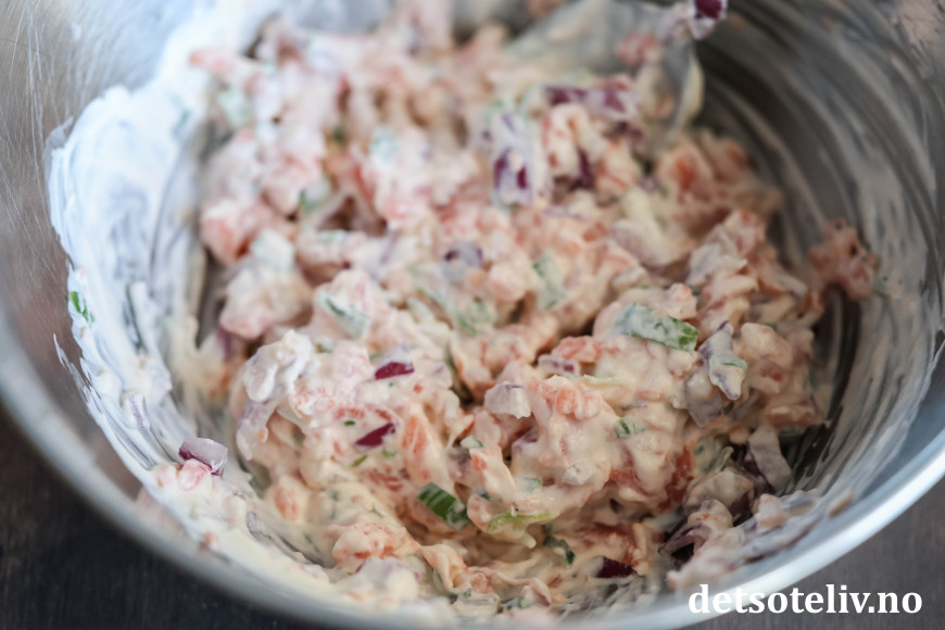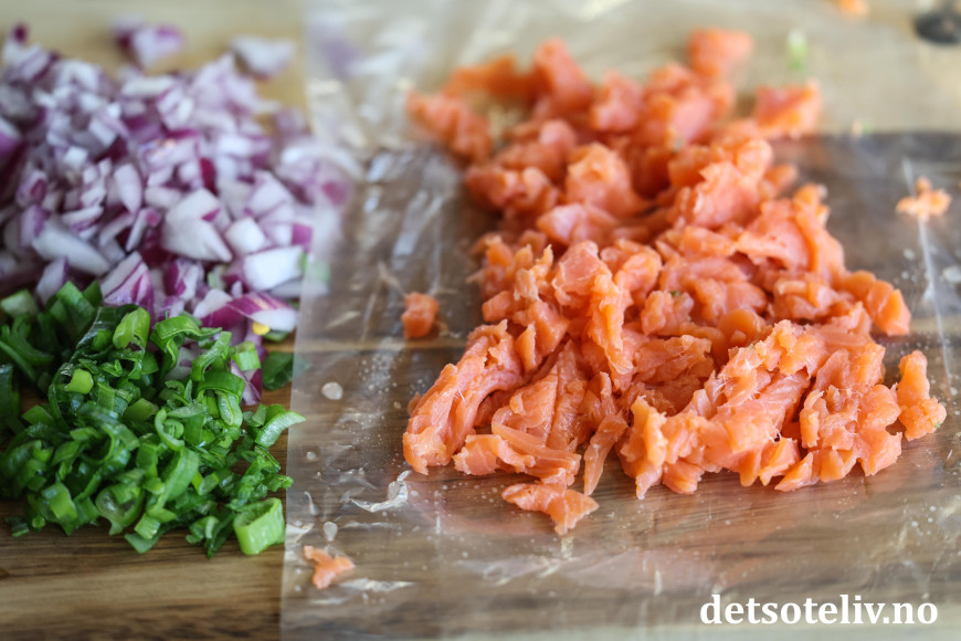 Bland fisken med seterrømme og fint hakket rødløk og vårløk (spar litt hakket løk til pynt). Smak til med litt kvernet salt og pepper.
