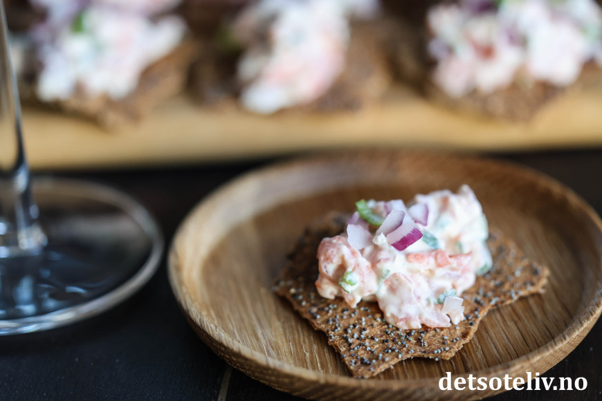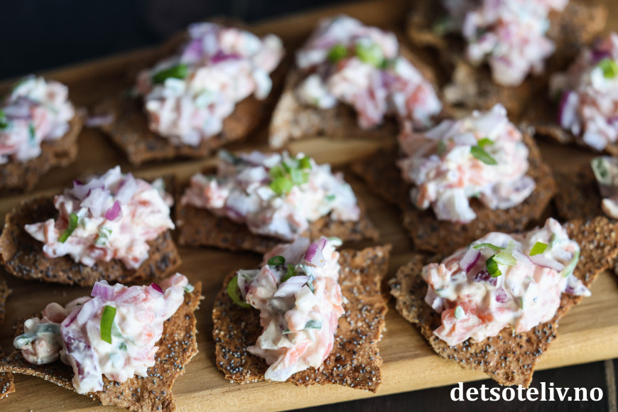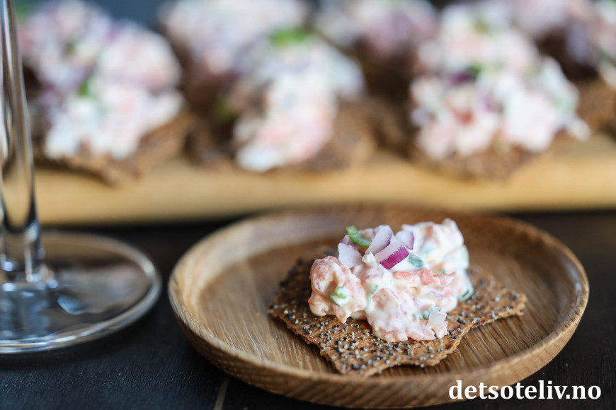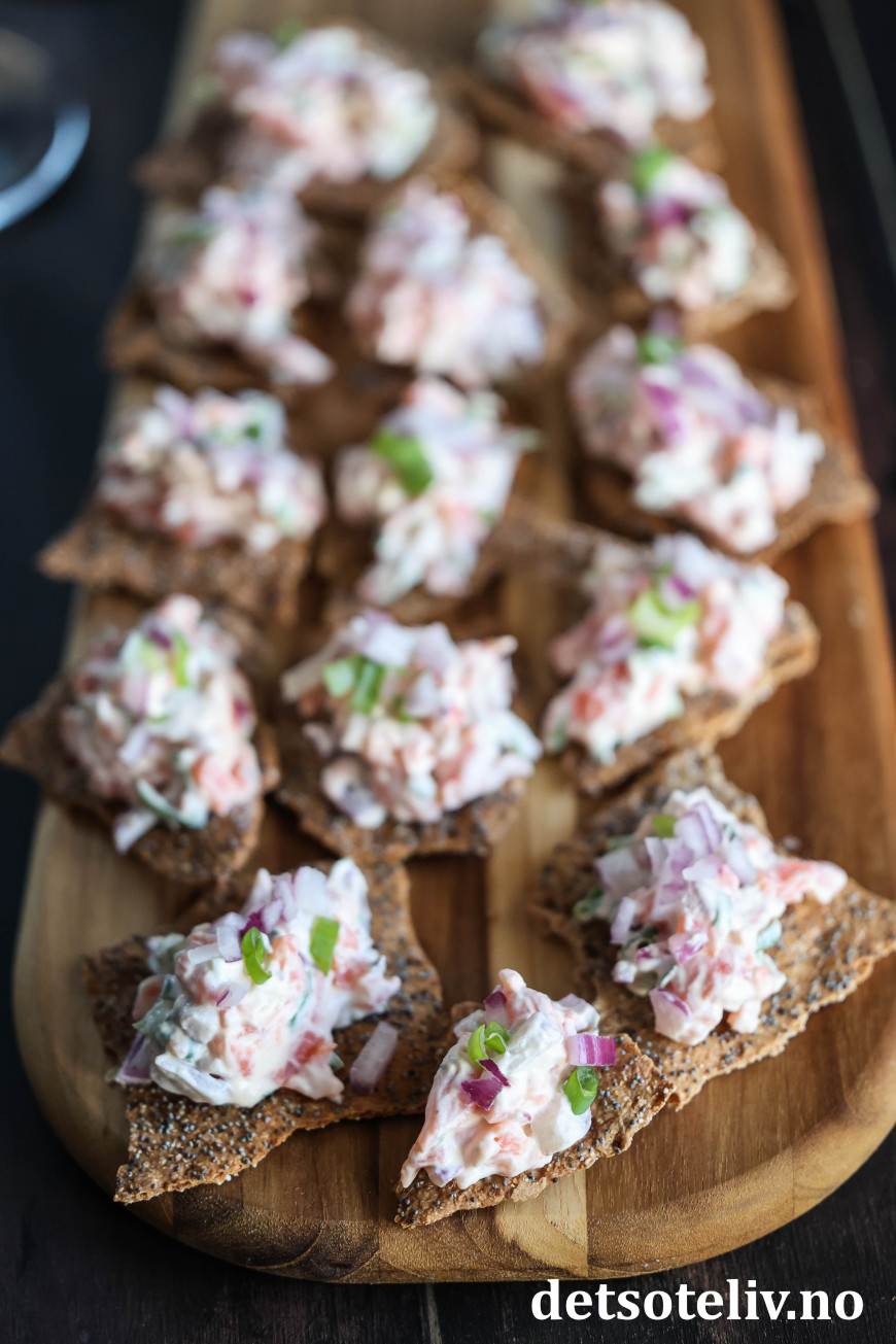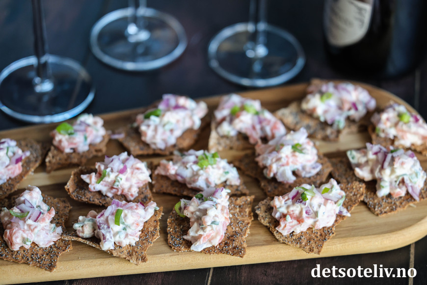 Hvis du er av dem som synes at rakfisk kan være litt sterkt, kan det likevel hende at du liker disse kanapéene veldig godt fordi rømme og løk gjør at rakfisksmaken blir mye mildere. 😊