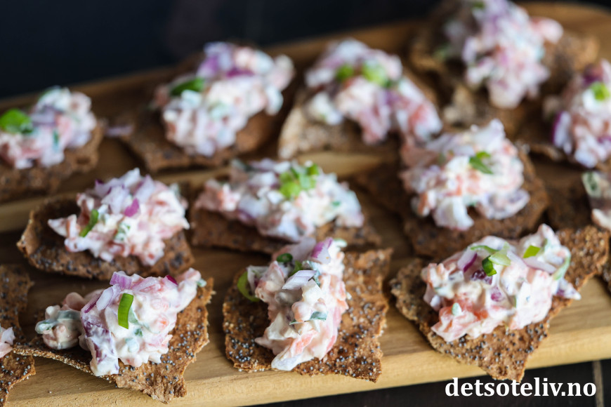 Jeg har brukt grove knekkebrødbiter sammen med rakfiskrøren som gir kanapéene et rustikk utseende, men det går like fint å bruke for eksempel små kjeks, sprøstekte baguetteskiver eller biter av rugbrød.