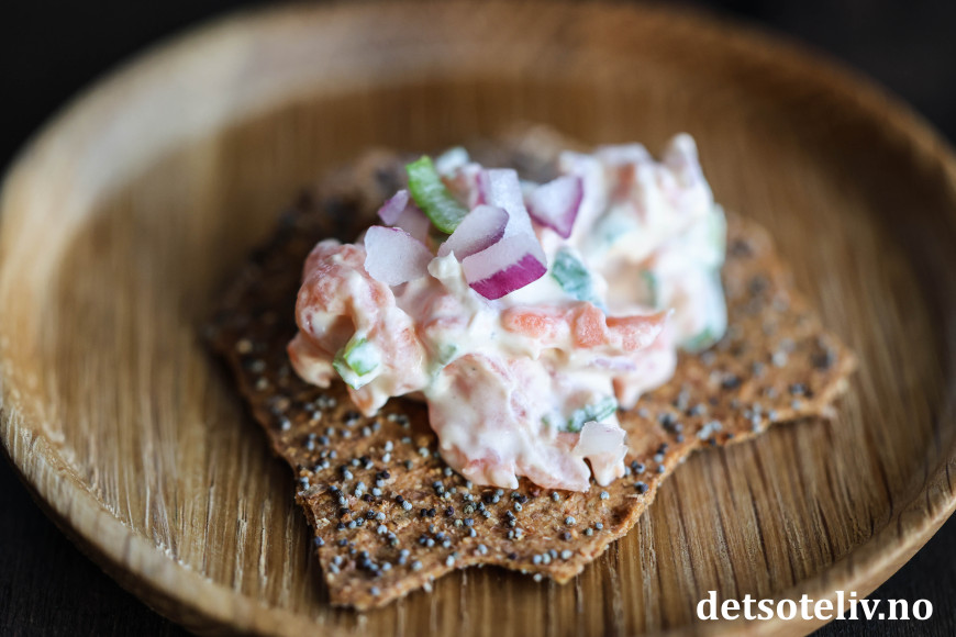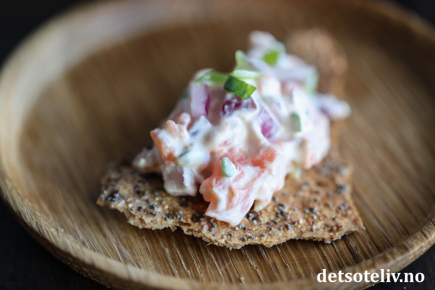 ♥ Jeg brukte her et veldig godt, sprøtt knekkebrød som jeg har kjøpt på et matmarked. Dersom du ikke får tak i dette, er det mye annet du kan bruke. Det kan være andre typer knekkebrød eller flatbrød (men det må være litt tykt for å tåle vekten av rakfiskrøren). Eller du kan bruke små kjeks (det kan være salte kjeks, ostekjeks eller lignende). Kanapéer kan også lages av små biter av brød, som du eventuelt kan steke i litt smør i forkant. Det blir også lekkert å steke små firkanter av butterdeig som du deretter topper med rakfiskrøren.