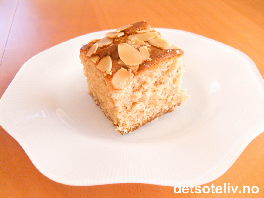 Ha deigen i en liten, bakepapirkledd langpanne (ca 20x30 cm). Dryss over mandelflarn.