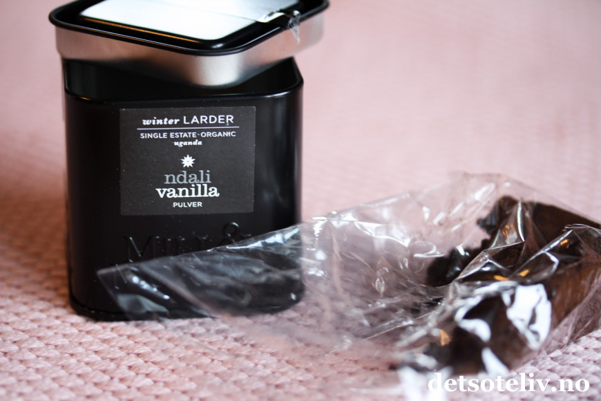 ♥ For å få ekstra god smak på denne kaken, har jeg brukt ekte vaniljepulver fra Mill & Mortar. Produktet består av malte økologiske, supreme vaniljestenger som produseres i Uganda. Selges blant annet i mange av butikkene til Meny og Coop Mega.