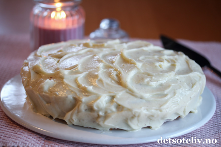 Visp sammen romtemperert kremost med mykt, romtemperert smør. Bland i vaniljepulveret og deretter melis til du får en passe tykk kremostglasur. Fordel ostekremen over kaken og NYT!
