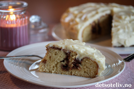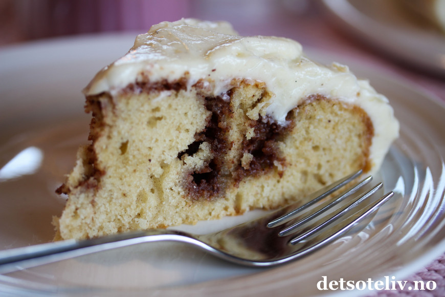 ♥ Ikke rør for mye når du skal mormorere deigen, for da blander kanelfyllet seg for mye med kakedeigen. Jeg drar kniven bare gjennom deigen 2-3 ganger for å få en lett marmorering.