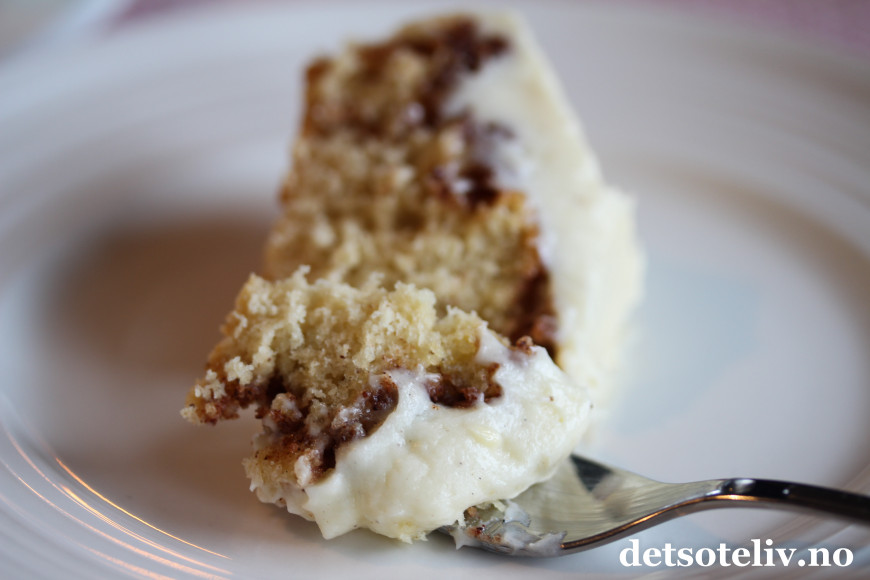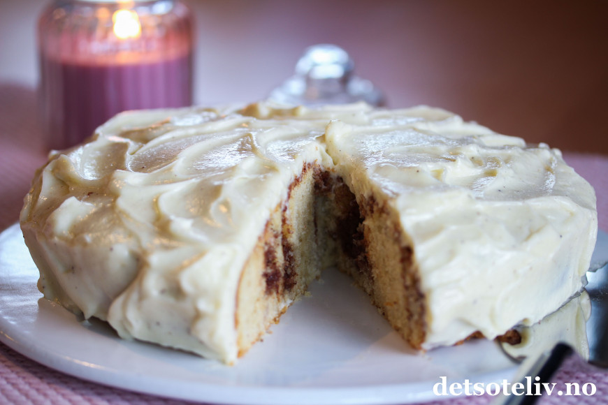 ♥ Kanelbollekaken holder seg myk i flere dager om den pakkes inn i plast. Kaken kan fryses både med og uten ostekrem.