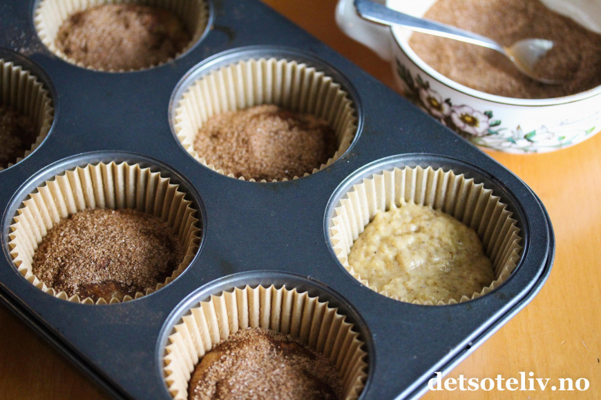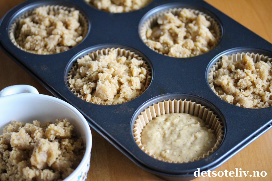 Til smuldredeigen blandes mel, hvitt og brunt sukker og kanel sammen. Smelt smøret og bland i så du får en smuldrete deig. Fordel litt av smuldredeigen på toppen av hver muffins.