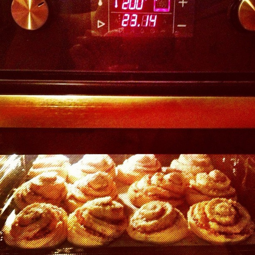 Her hever kanelbollene seg i ovnen. Lukter deilig på kjøkkenet!