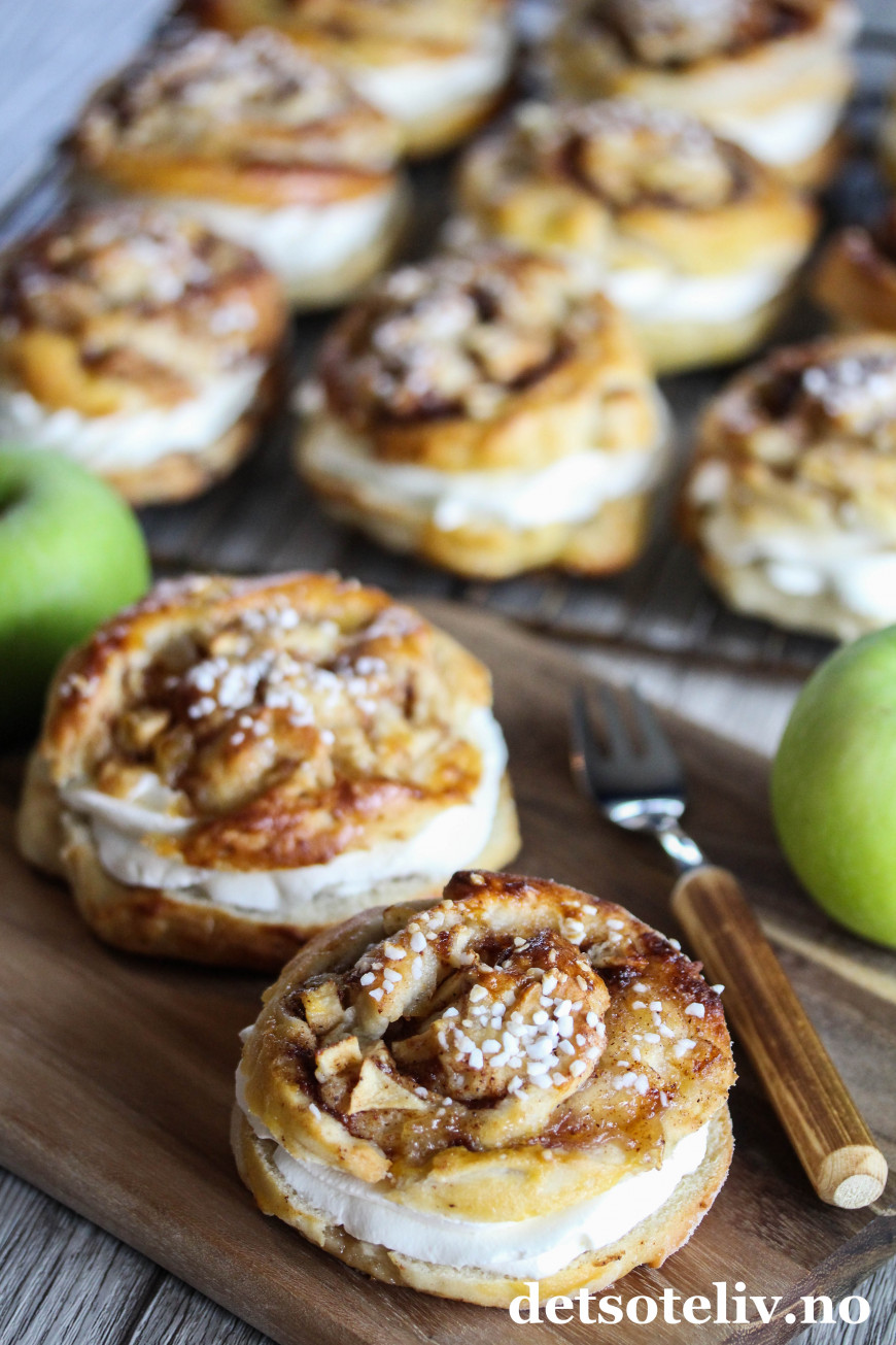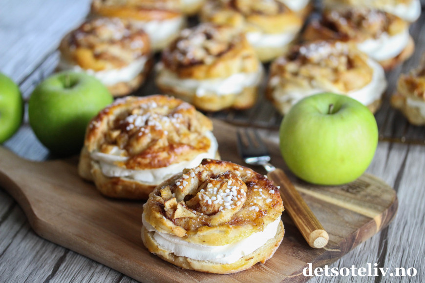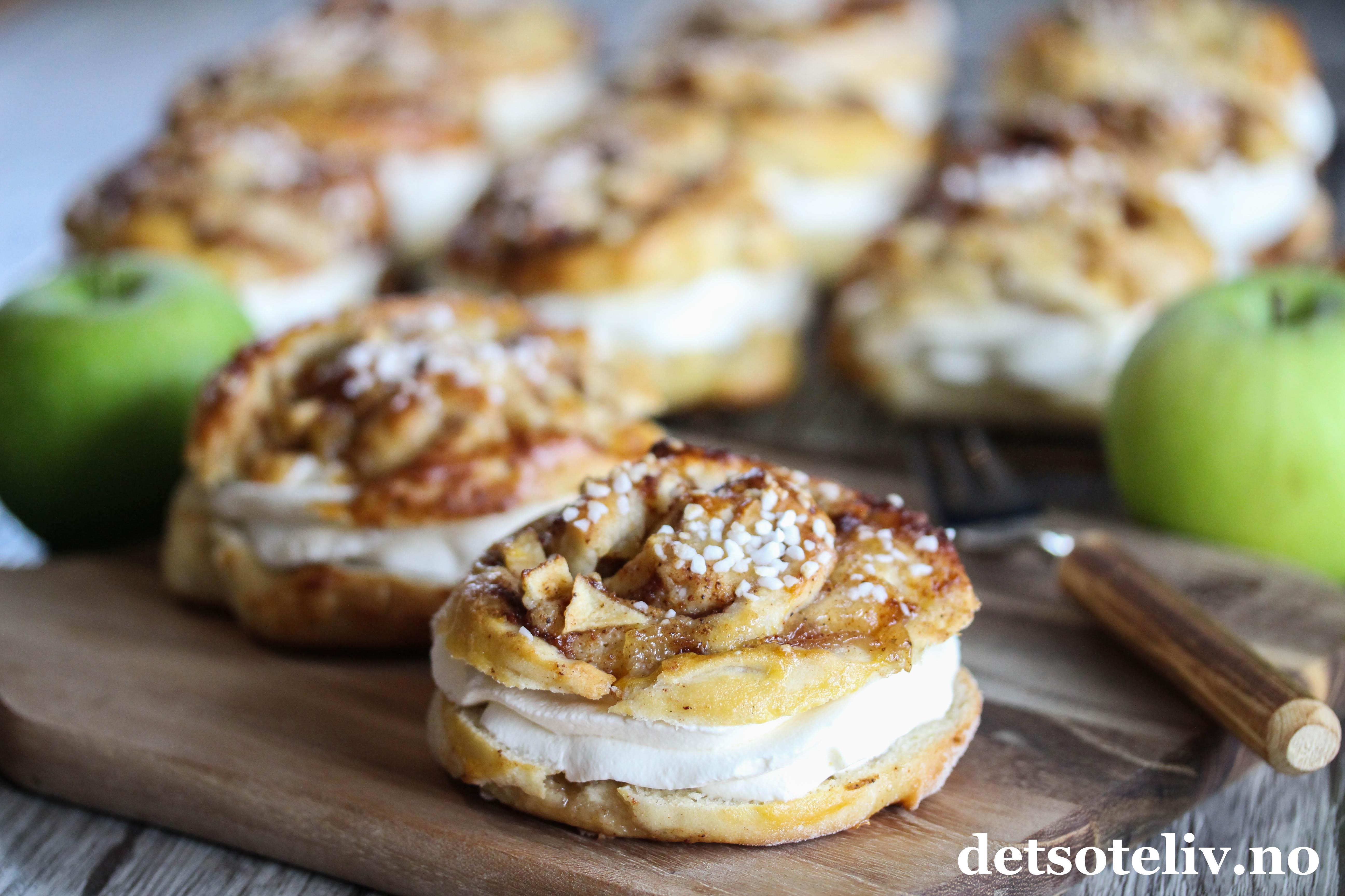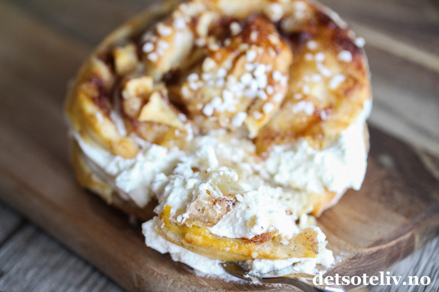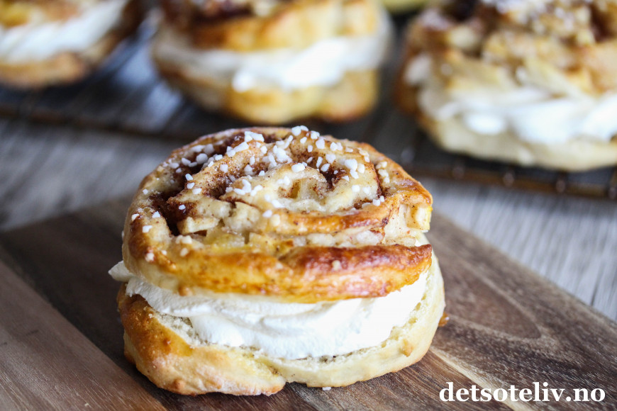 Kanelboller med eplefyll og fløtekrem er klare for servering.