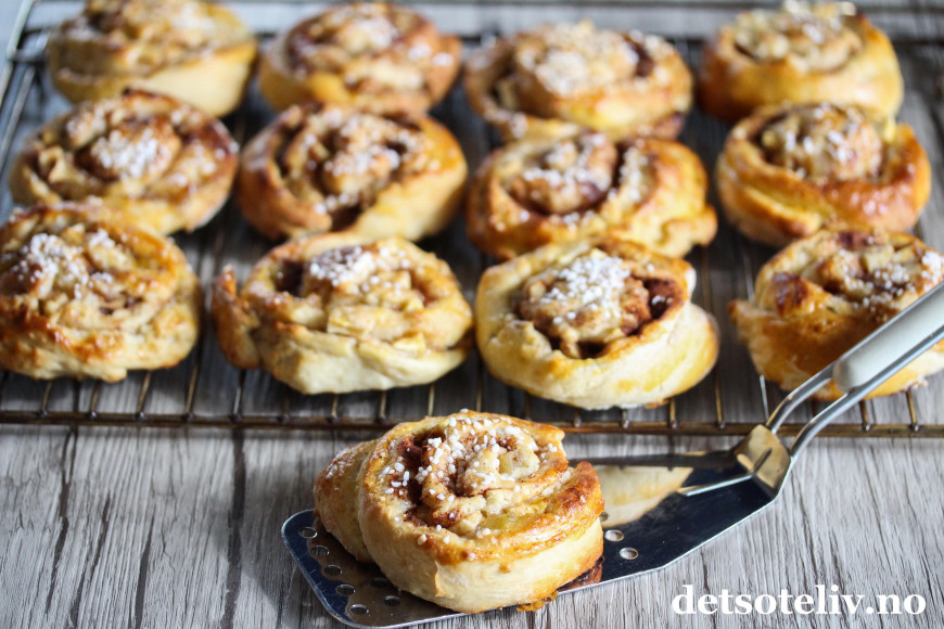 Den 4. oktober var det "Kanelbollens dag", noe jeg markerte med en kjempedeilig Cinnabon, som er en gigastor, amerikansk kanelbolle med ostekremglasur. Dette kommer det snart oppskrift på her på bloggen. Imens poster jeg her oppskriften på saftige Kanelboller med eple og kremfyll. Dette er store, deilige kanelsnurrer med eplesyltetøy og eplebiter, som jeg i tillegg har fylt med luftig fløtekrem.