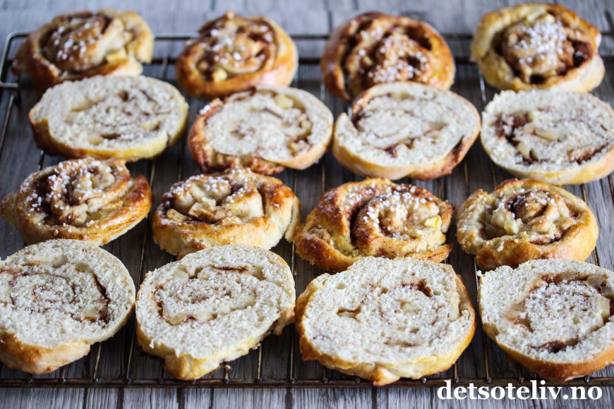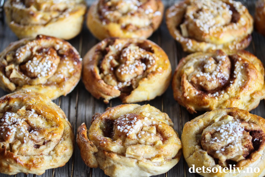 Stek bollene midt i ovnen ved 230°C i 10-12 minutter. La eplebollene avkjøles til de er helt kalde.