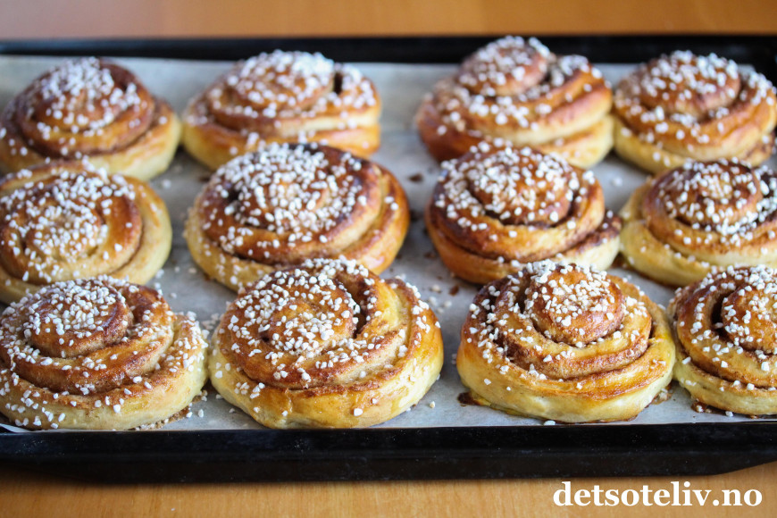 Kjevle ut deigen til en stor, kvadratisk leiv. Smør på mykt smør og dryss over rikelig med sukker og kanel. Rull leiven sammen til en tykk, fast rull. Skjær store skiver som du legger på bakepapirdekkede stekeplater. La dem heve lunt i ca. 40 minutter.