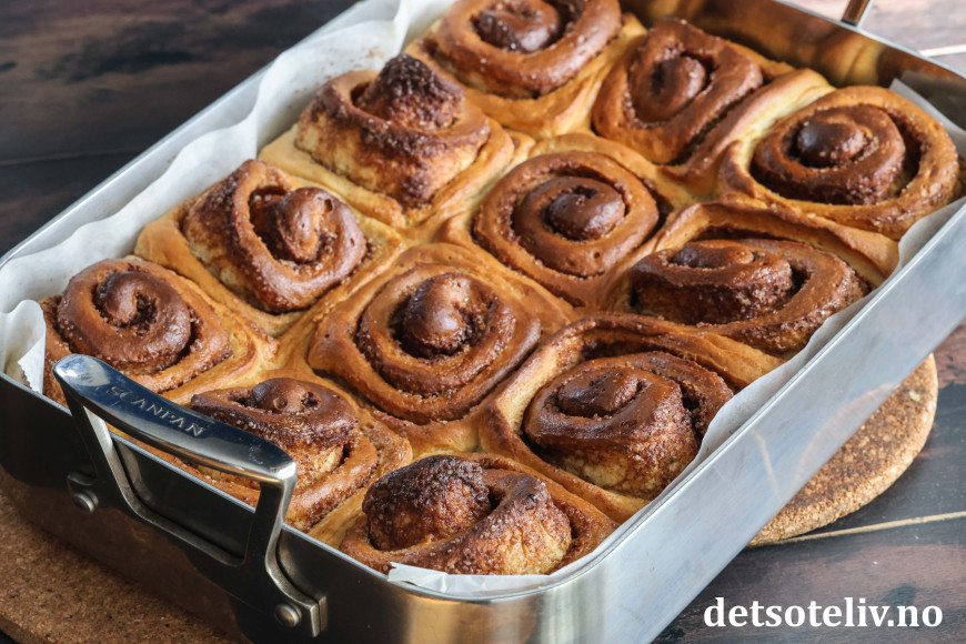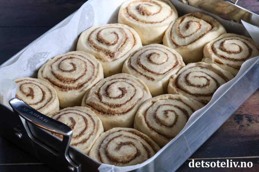 ♥ Jeg har her brukt en mellomstor form (av merket Scanpan) som måler 24 x 35 cm, altså litt større enn en liten langpanne. For å få plass til alle kanelbollene må du skjære dem i tykke skiver, så bollene blir nokså høye. De vil også vokse helt sammen i løpet av stekingen. Jeg har funnet ut at dette gir best resultat når man heller over fløte. Du kan også steke bollene i en stor langpanne (ca. 30 x 40 cm), men da vil kanelbollene blir en god del flatere enn de du ser på bildet.