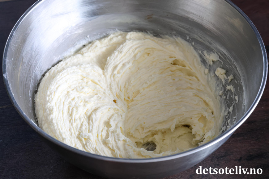 Pisk sammen kremost, melis, romtemperert smør og sitronsaft til en ostekrem.