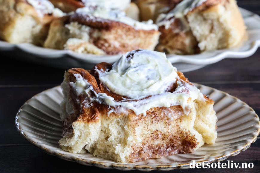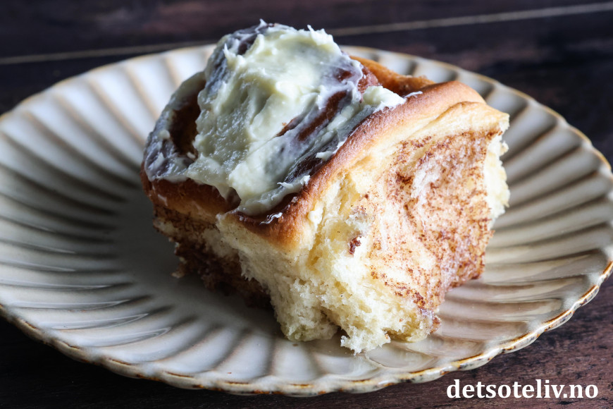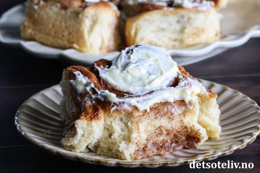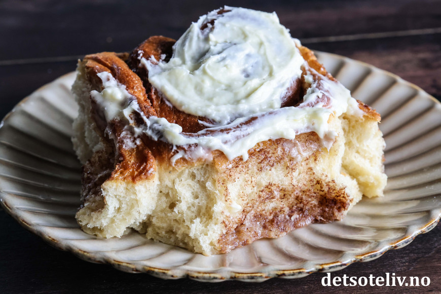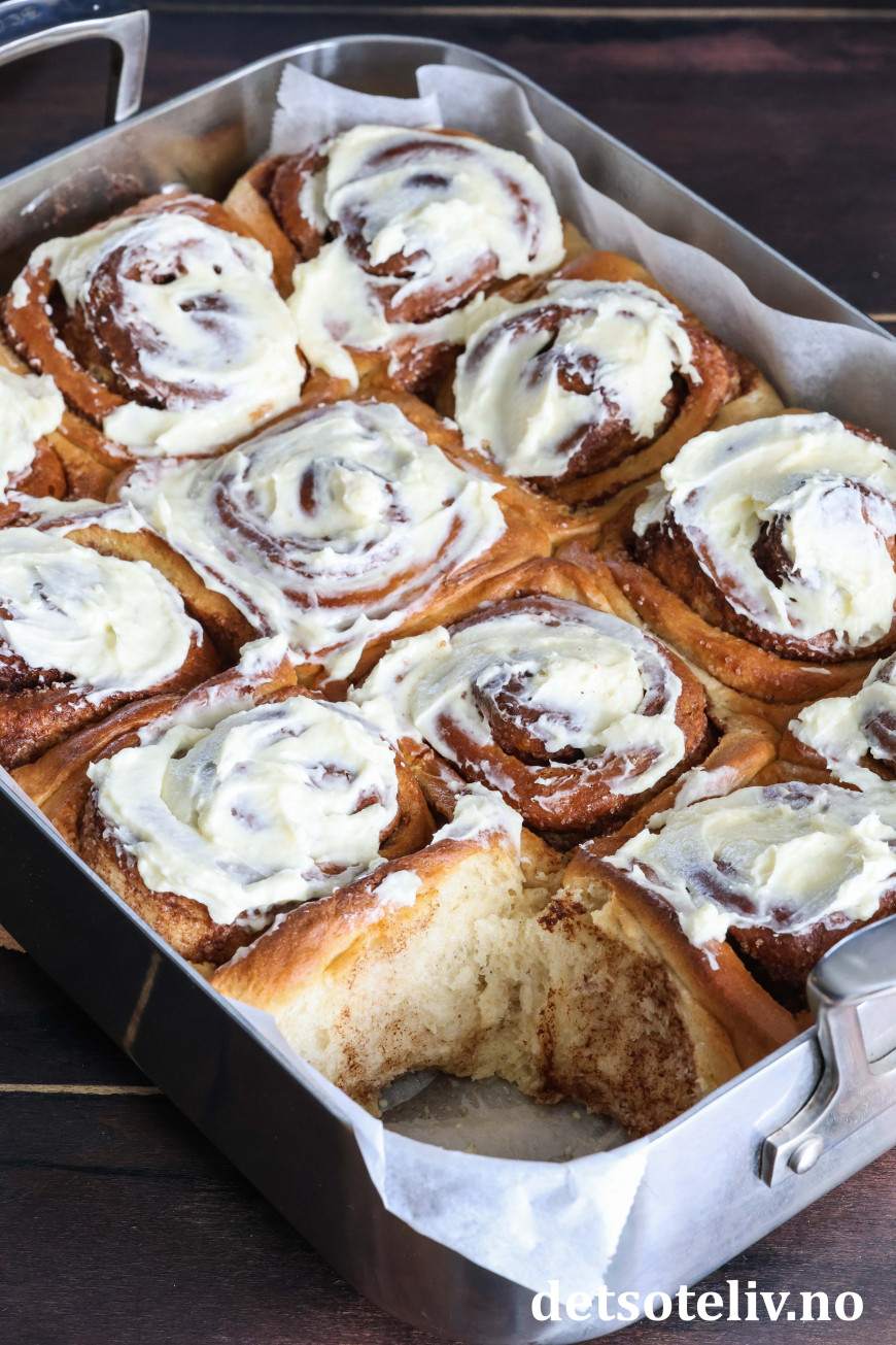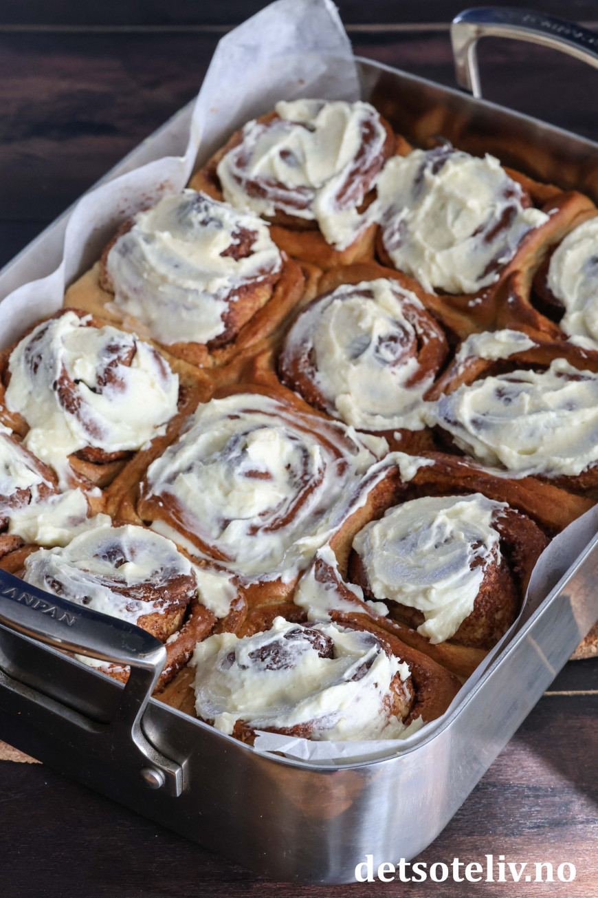 Jeg har tatt utgangspunkt i min favorittoppskrift på Verdens beste kanelboller, men har halvert oppskriften og gjort noen justeringer ved å bruke mer kanelfyll og toppe bollene med ostekremglasur.